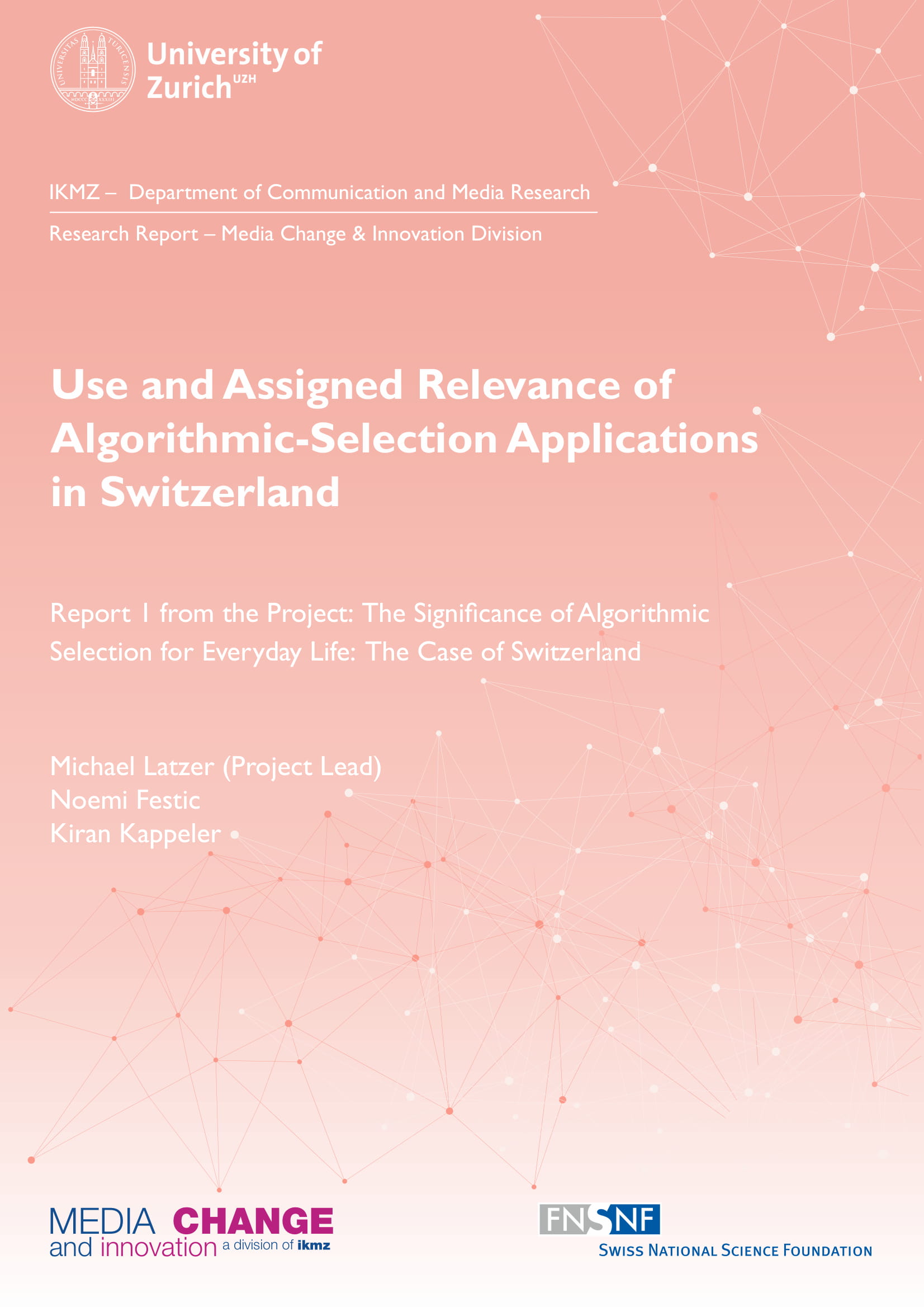 - Latzer, Michael / Festic, Noemi / Kappeler, Kiran (2020): Use and Assigned Relevance of Algorithmic-Selection Applications in Switzerland. Report 1 from the Project: The Significance of Algorithmic Selection for Everyday Life: The Case of Switzerland. Zurich: University of Zurich. http://mediachange.ch/research/algosig