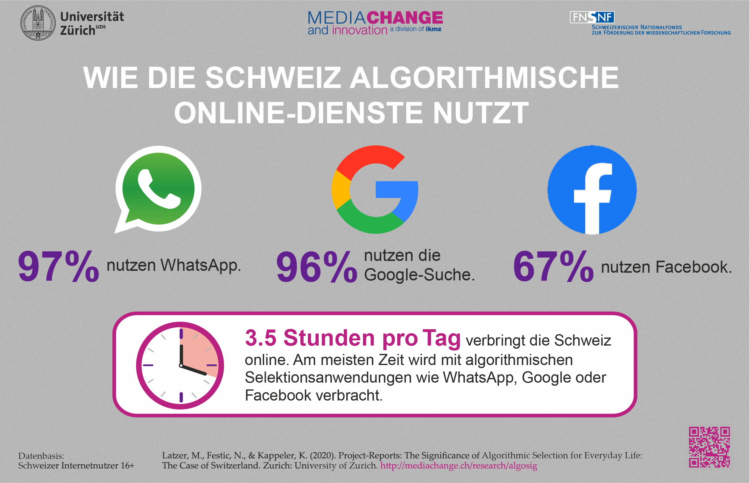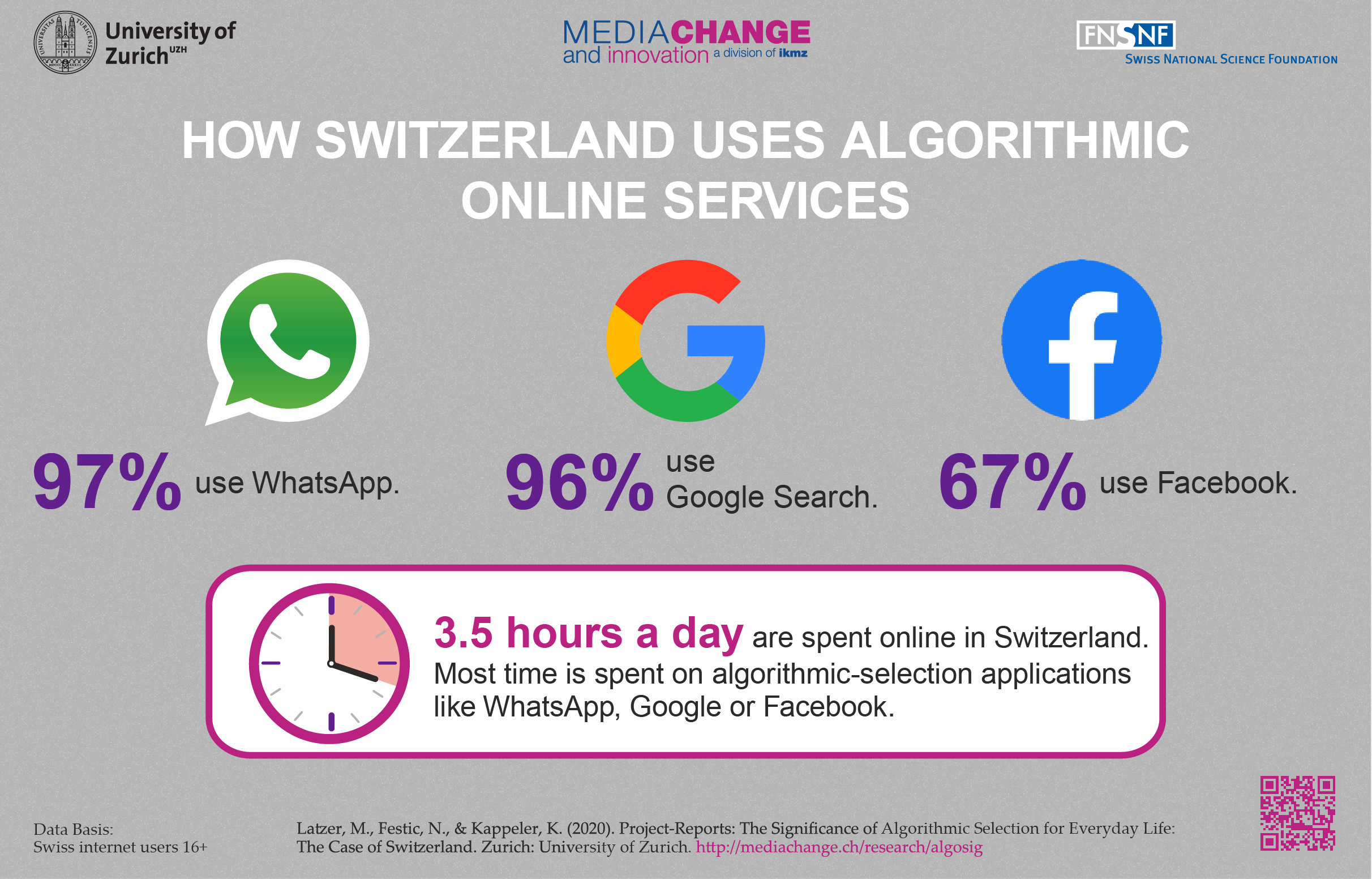 - Latzer, Michael / Festic, Noemi / Kappeler, Kiran (2020): Use and Assigned Relevance of Algorithmic-Selection Applications in Switzerland. Report 1 from the Project: The Significance of Algorithmic Selection for Everyday Life: The Case of Switzerland. Zurich: University of Zurich. http://mediachange.ch/research/algosig