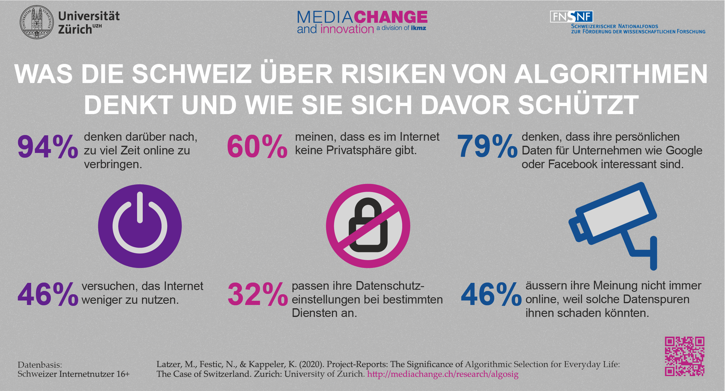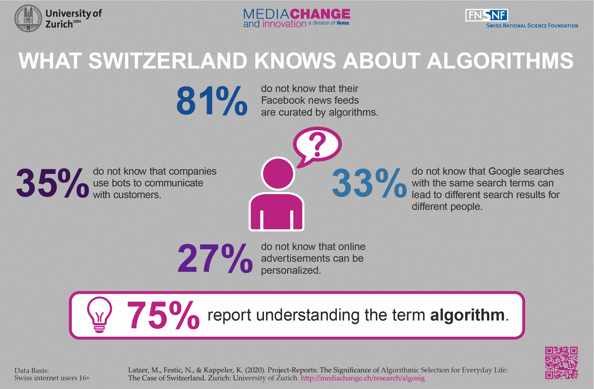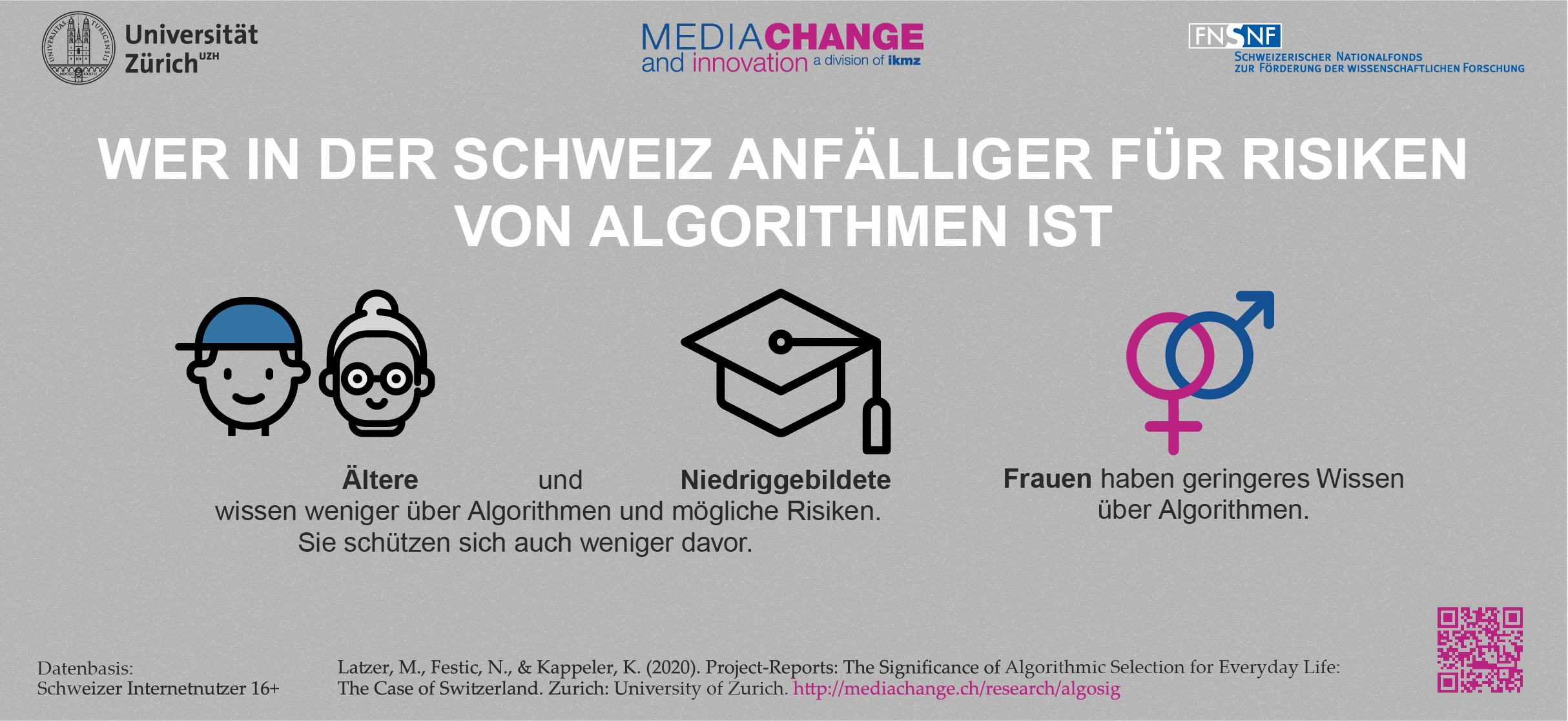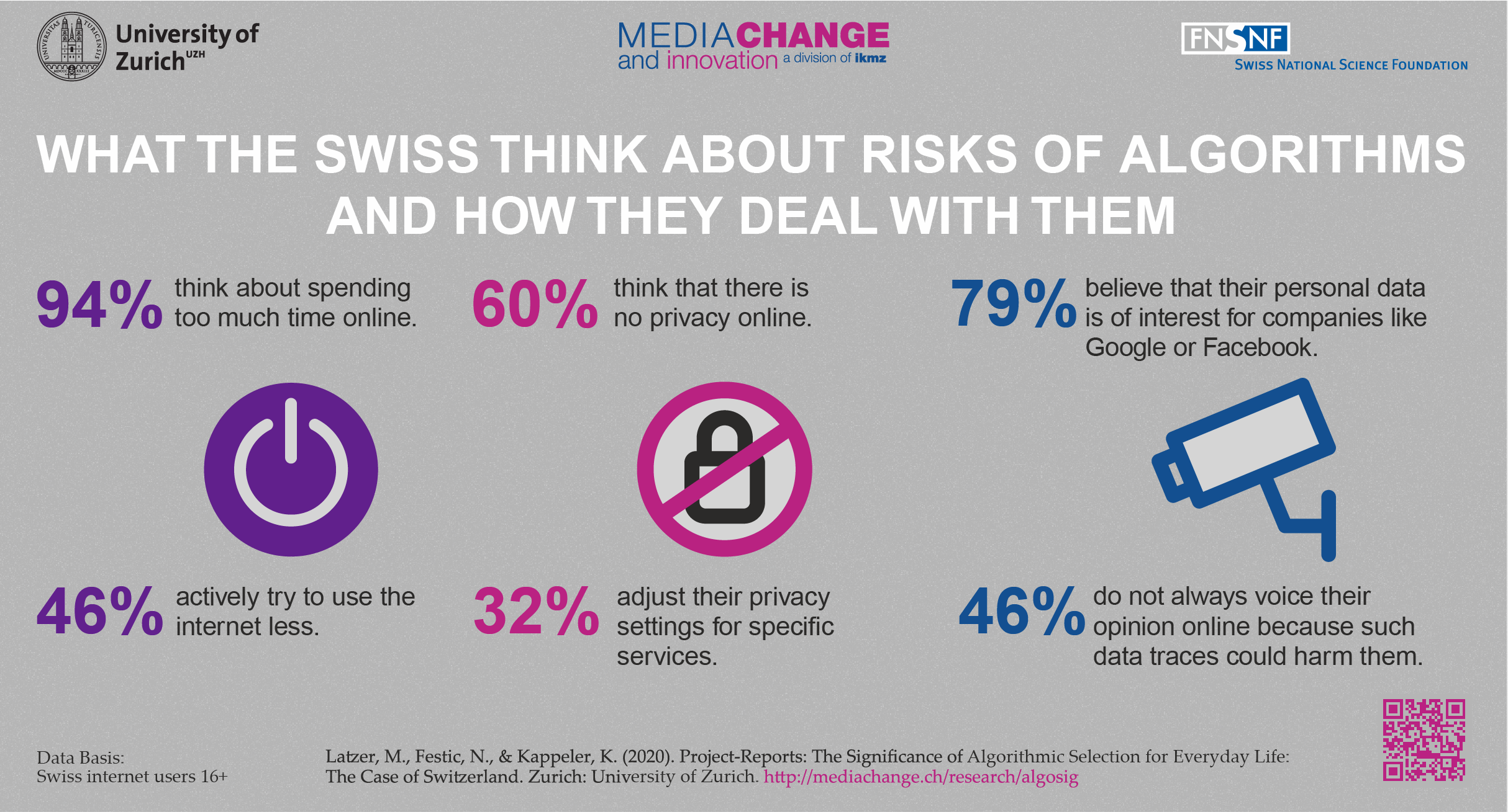 - Latzer, Michael / Festic, Noemi / Kappeler, Kiran (2020): Awareness of Risks Related to Algorithmic Selection in Switzerland. Report 3 from the Project: The Significance of Algorithmic Selection for Everyday Life: The Case of Switzerland. Zurich: University of Zurich. http://mediachange.ch/research/algosig